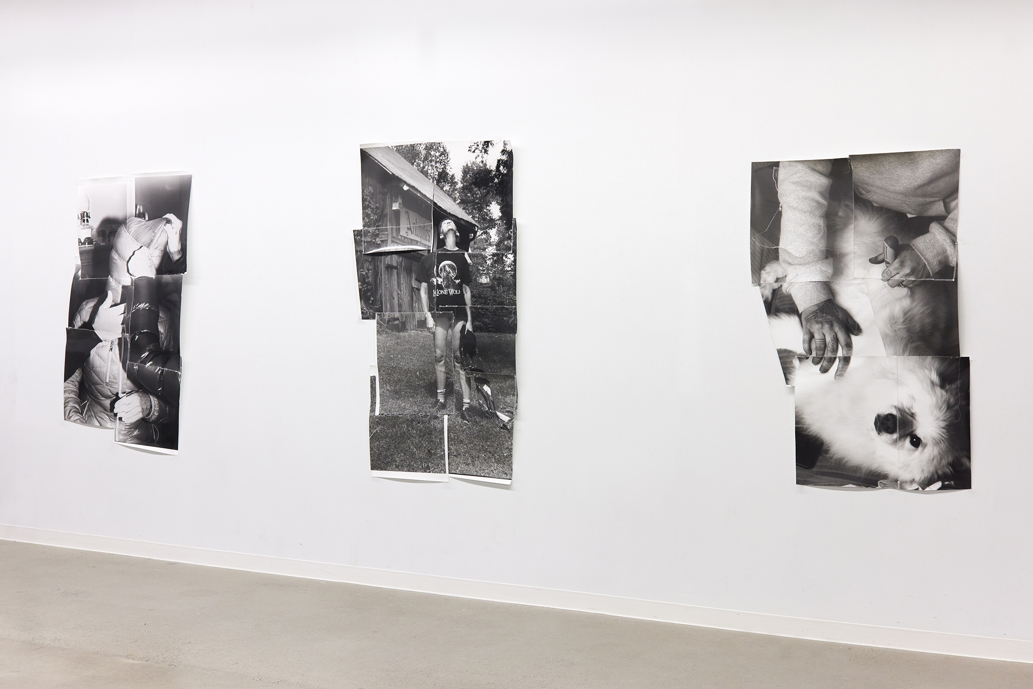 Three central figures are in communication through different, though comparable circumstances of holding, pausing, waiting, being held down or held in. Perceptions of these positions are flexible; the materiality of each individual construction alludes to the paradox that is, the possibility of (enclosed) and individual liberation.